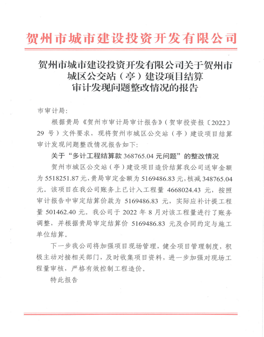 下一篇:關于賀州市城投公司辦公樓附屬裝修工程結算審計發現問題整改情況的報告