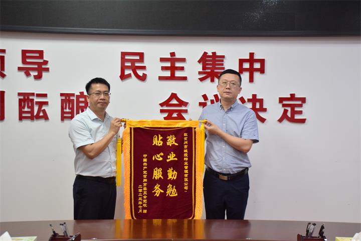 7月12日下午,賀州市市委黨校副校長唐永波一行來到城投集團,將一面印有“敬業(yè)勤勉 貼心服務(wù)”的錦旗和感謝信送到了城投集團黨委委員、副總經(jīng)理陳桂軍手中,為城投物業(yè)公司高質(zhì)量服務(wù)點贊。