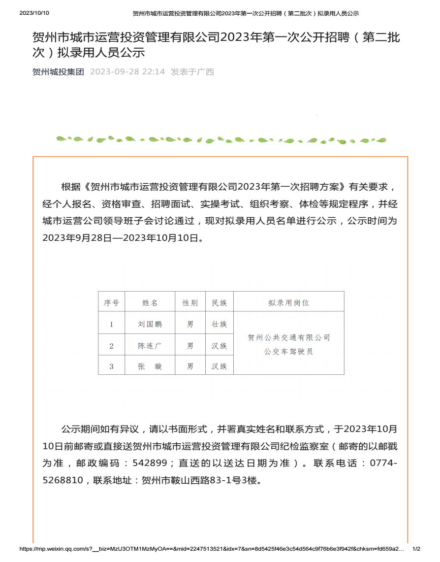 根據(jù)《廣西賀州城建投資集團(tuán)有限公司2022年第一次招聘方案》有關(guān)要求,經(jīng)個(gè)人報(bào)名、資格審查、招聘面試...